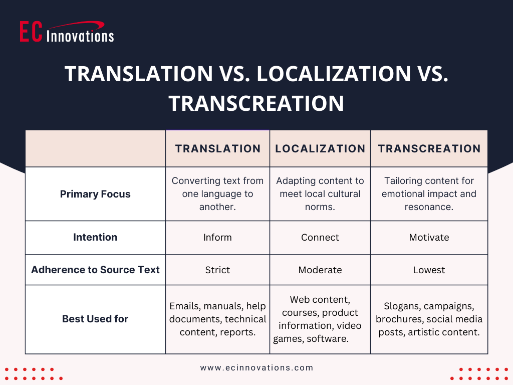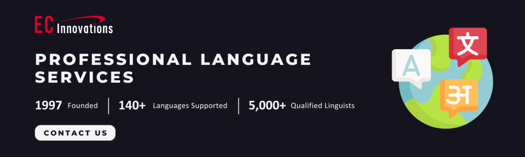 As you consider expanding your global presence, choosing the right language services can make all the difference. As a professional language services provider, EC Innovations offers specialized translation, localization and transcreation services tailored to your specific needs and goals. Whether you’re launching a new product, expanding into international markets, or looking to connect with diverse audiences, our team is here to help. For more information about our range of services and how we can help you, please get in touch at info@ecinnovations.com.
